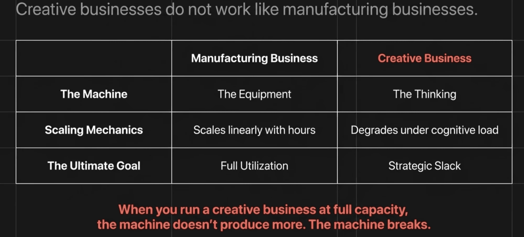 But in a creative business, the machine is the thinking. And thinking doesn’t scale linearly with hours. It degrades, gradually then suddenly, in ways that are hard to measure until the damage is already done.